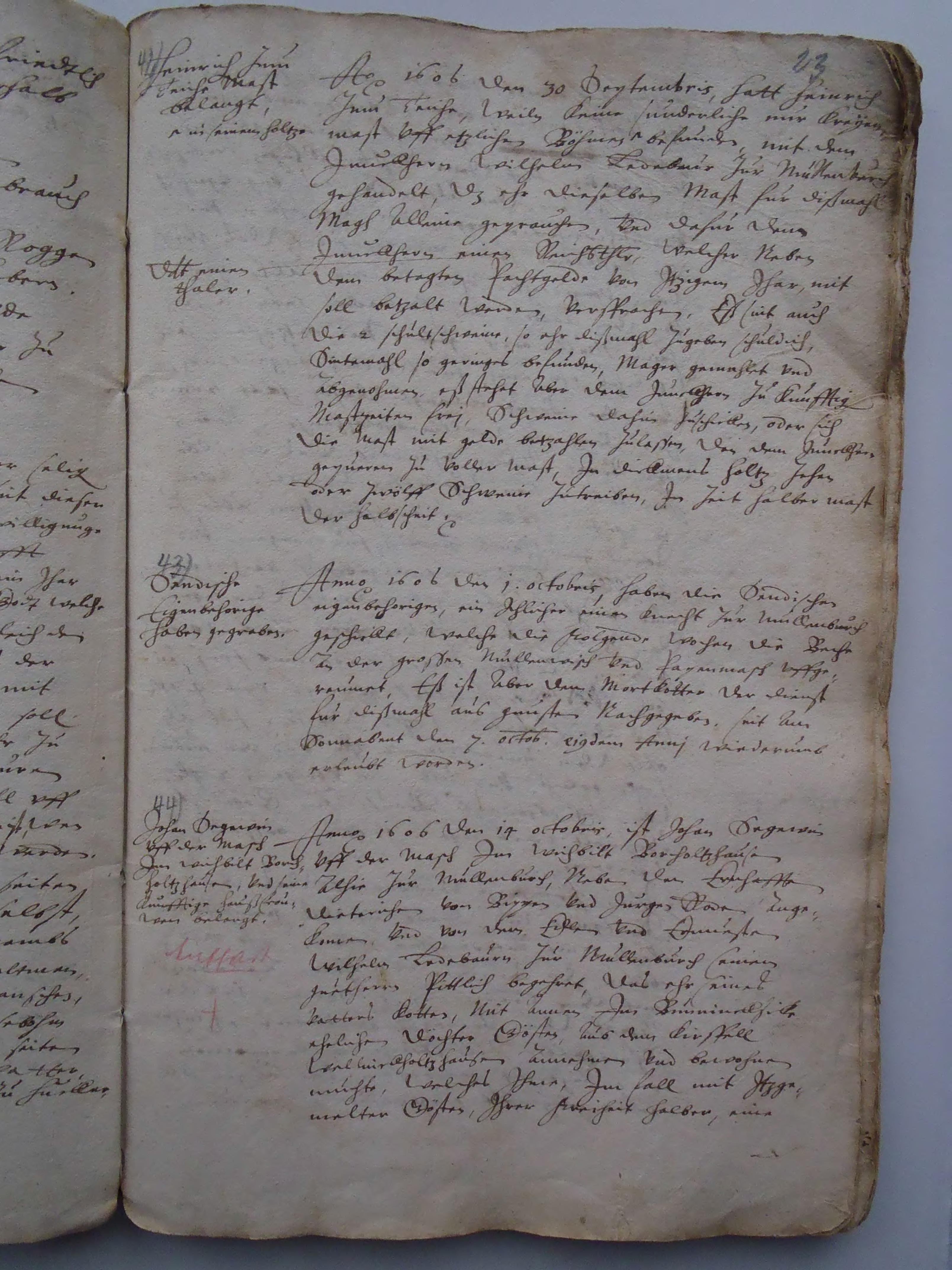 Anno 1606 den 14 Octobris, ist Johan Segewin uff der Masch im Wichbilt Borcholtzhausen alhie zur Müllenburch, neben dem Ernhafften Dieterichen von Bippen und Jürgen Roden angekomen, und von dem Edlen und Ernvesten Wilhelm Ledebaurn zur Müllenburch seinen Guetherrn pittlich begehret, das ehr seines Vatters Kotten, mit Annen im Bunnincksike eheliche Döchter Gösten, aus dem Kirspell Wellinckholtzhausen annehmen und bewohnen müchte, welches ihme, im Fall mit itzgemelter Gösten, ihrer Freiheit halber, eine