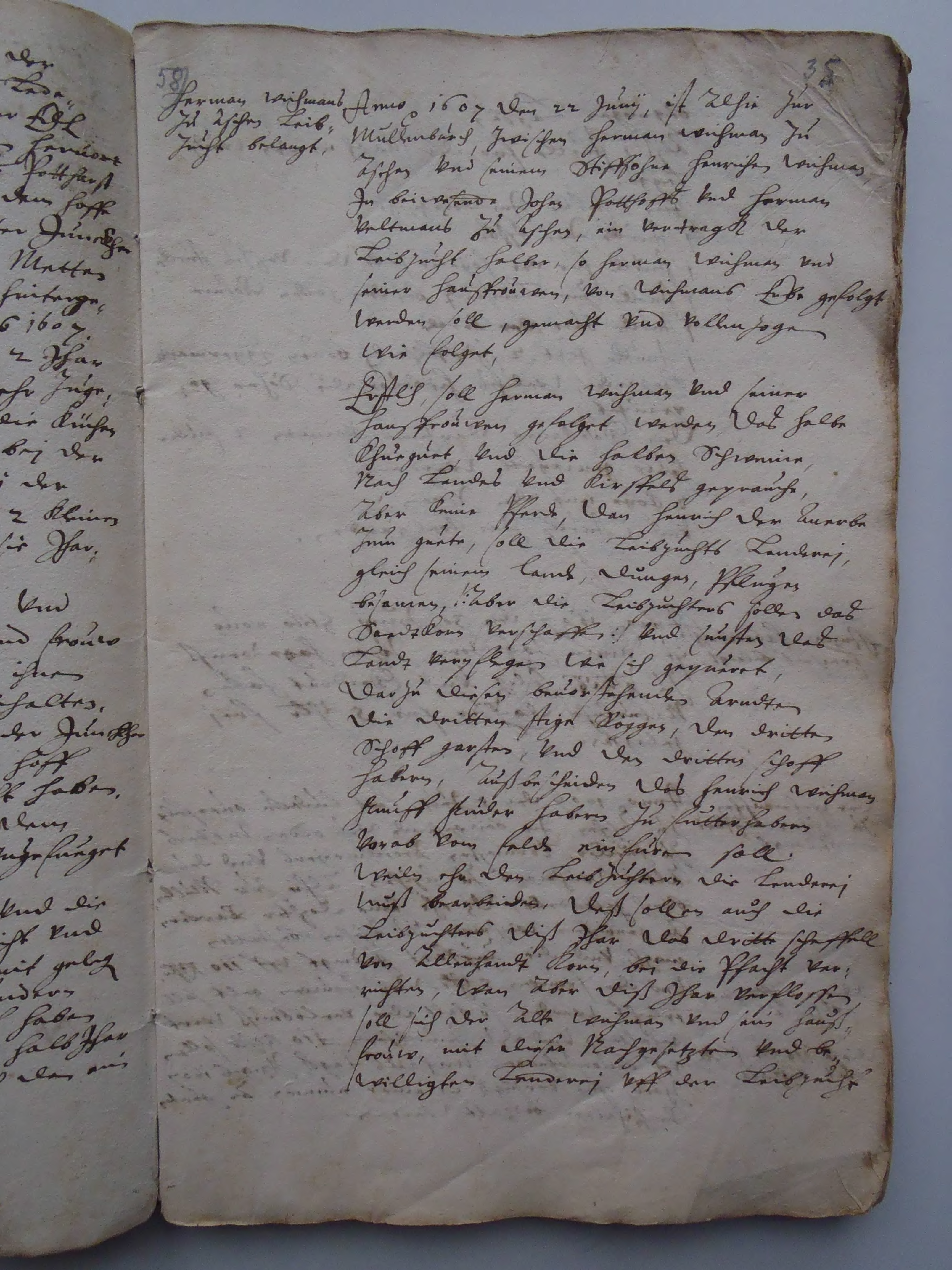 Anno 1607 den 22 Juny, ist alhie zur Müllenburch, zwischen Herman Wichman zu Aschen und seinem Stiffsohne Henrichen Wichman, in Beiwesende Johan Potthoffs und Herman Veltmans zu Aschen, ein Vertragh der Leibzucht halber, so Herman Wichman und seiner Hausfrouwen, von Wichmans Erbe gefolgt werden soll, gemacht und vollenzogen wie folget, Erstlich, soll Herman Wichman und seiner Hausfrouwen gefolget werden, das halbe Khueguet, und die halben Schweine, nach Landes und Kirspels geprauche, aber keine Pferde, dan Henrich der Anerbe zum Guete, soll die Leibzuchts Lenderej, gleich seinem Lande, düngen, pflügen besamen, (aber die Leibzüchters sollen das Saedtkorn verschaffen) und sünsten das Landt verpflegen wie sich gepueret, darzu diesen bevorstehenden Arndten die dritten Stige Roggen, den dritten Schoff Garsten, und den dritten Schoff Habern, außbescheiden das Henrich Wichman fünff Fuder Habern zu Futterhabern vorab vom Felde einfüren soll. Weile ehr den Leibzüchtern die Lenderej muß bearbeiden, daß sollen auch die Leibzüchters diß Jhar das dritte Scheffel von allerhandt Korn, bei die Pfacht verrichten, wan aber diß Jhar verflossen, soll sich der alte Wichman und sein Haußfrouw, mit diesen nachgesetzten und bewilligten Lenderej uff der Leibzucht