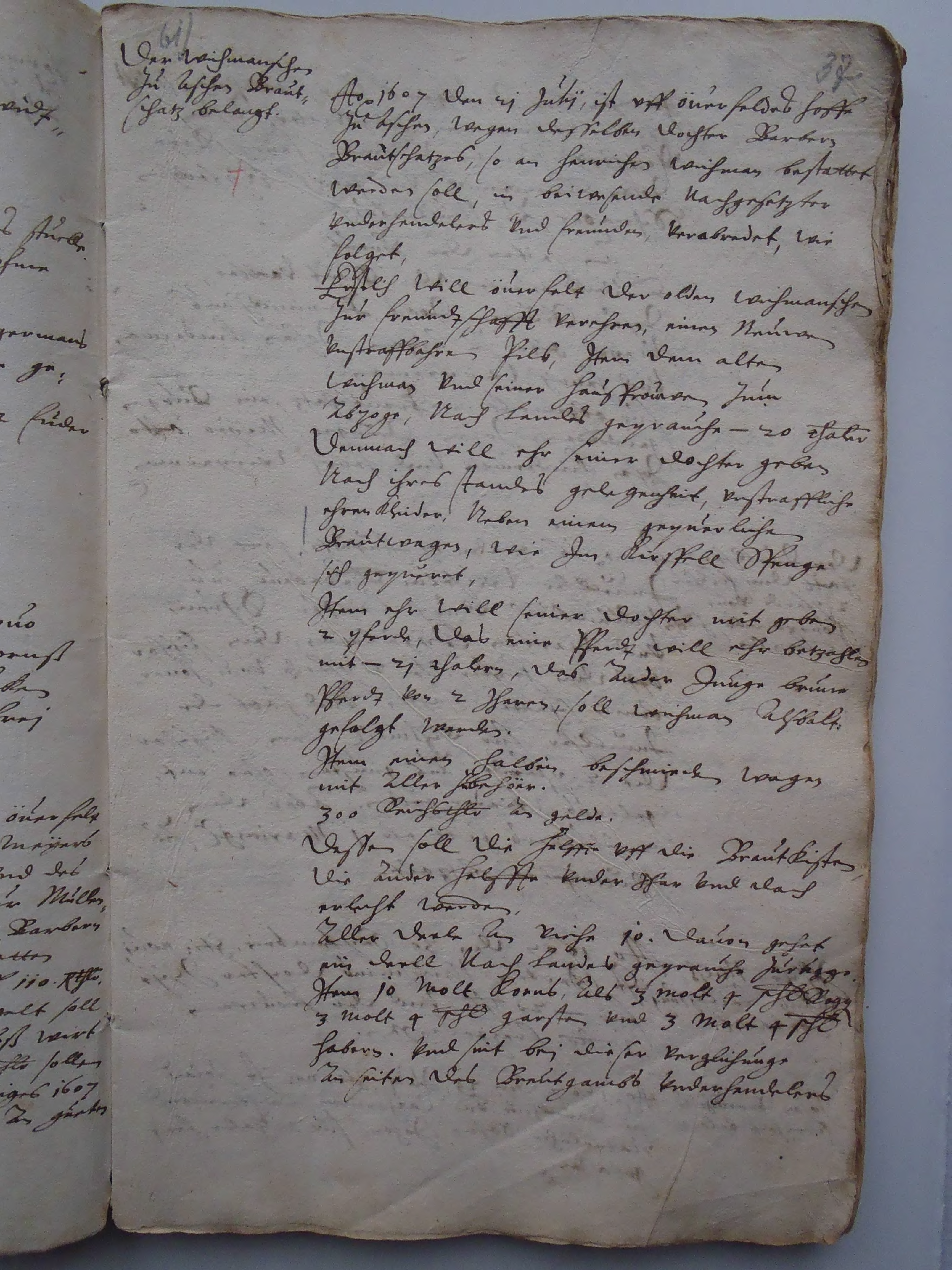 Anno 1607 den 21 July, ist uff Överfeldes Hoffe zu Aschen, wegen desselben Dochter Barbern Brautschatzes, so an Henrichen Wichman bestattet werden soll, in Beiwesende nachgesetzter Underhendelers und Freunden, verabredet, wie folget, Erstlich will Överfelt der alten Wichmanschen zur Freundtschafft verehren, einen neuwen unstraffbahren Pils, item dem alten Wichman und seiner Hausfrouwen zum Abzoge, nach Landesgeprauche 20 Thaler. Demnach will ehr seiner Dochter geben nach ihres Standes Gelegenheit, unstraffliche Ehrenkleider, neben einem gepuerlichen Brautwagen, wie im Kirspell Spenge sich gepueret. Item ehr will seiner Dochter mit geben 2 Pferde, das eine Pferdt will ehr betzahlen mit 21 Thalern, das ander junge bruwe Pferdt von 2 Jharen, soll Wichman alsbalt gefolgt werden. Item einen halben beschmieden Wagen mit aller Zubehöer. 300 Reichsthaler an Gelde. Dessen soll die Helffte uff die Brautkisten, die ander Helffte under Jhar und Dach erlecht werden. Aller Deele an Viehe 10. Davon gehet ein Deell nach Landesgeprauche zurügge. Item 10 Molt Korns, als 3 Molt 4 Scheffel Roggen 3 Molt 4 Scheffel Gersten und 3 Molt 4 Scheffel Habern. Und sint bei dieser Verglichunge an Seiten des Breutgambs Underhendelers