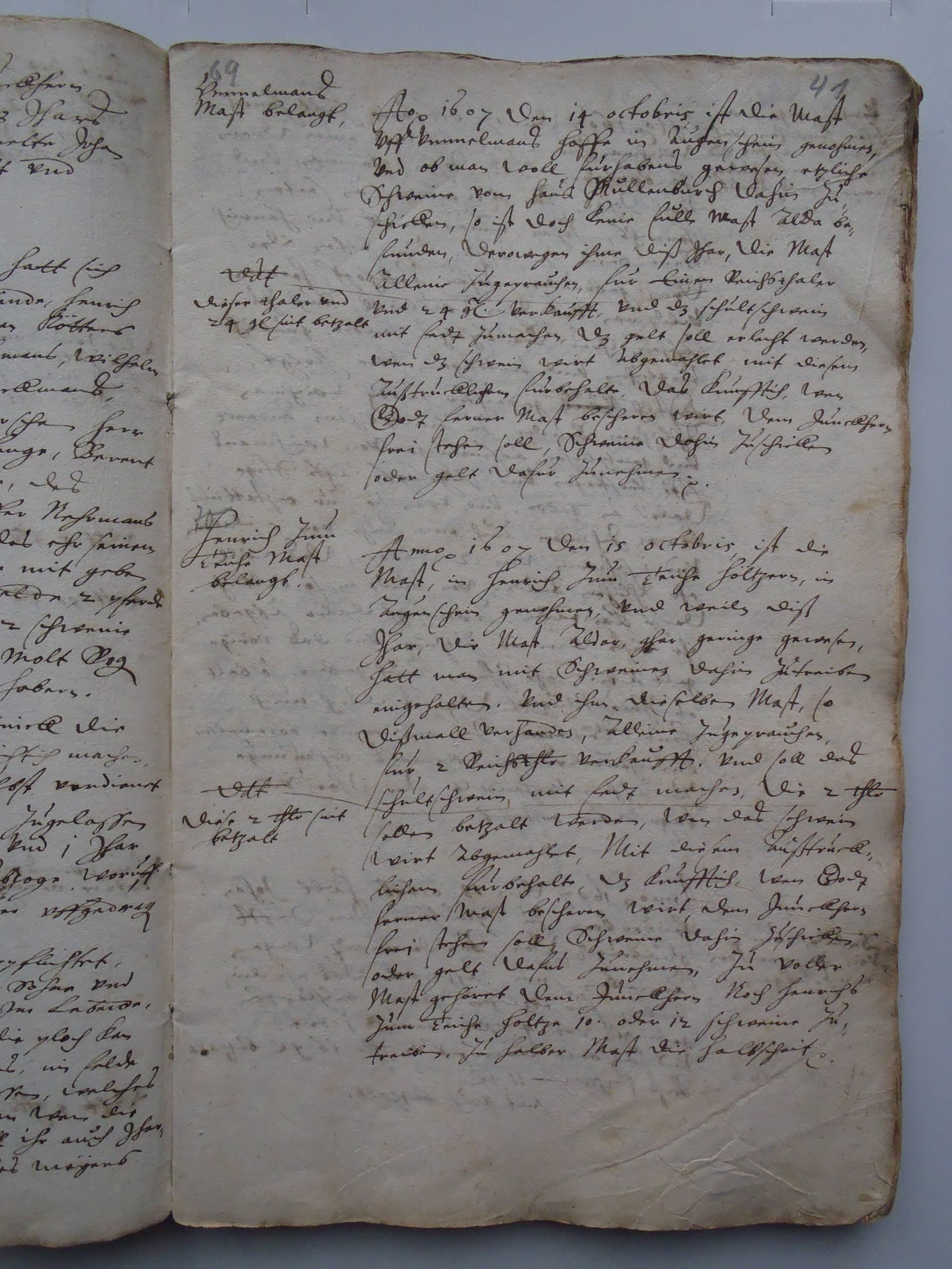 Anno 1607 den 15 Octobris, ist die Mast, in Henrich zum Teiche Höltzern, in Augenschein genohmen, und weile diß Jhar, die Mast aldar, ghar geringe gewesen, hatt man mit Schweine dahin zutreiben eingehalten. Und ihm dieselben Mast, so dißmall verhanden, alleine zugeprauchen, für 2 Reichsthaler verkaufft. Und soll das Schultschwein, mit fedt machen, die 2 Thaler sollen betzalt werden, wen das Schwein wirt abgemahlet, mit diesem außtrücklichem Fürbehalte, das künfftich, wen Godt ferner Mast bescheren wirt, dem Juckhern frei stehen soll, Schweine dahin zuschicken oder Gelt dafür zunehmen. Zu voller Mast gehöret dem Junckhern noch Henrichs zum Teiche Holtze 10 oder 12 Schweine zutreiben, in halber Mast die Halbscheit.