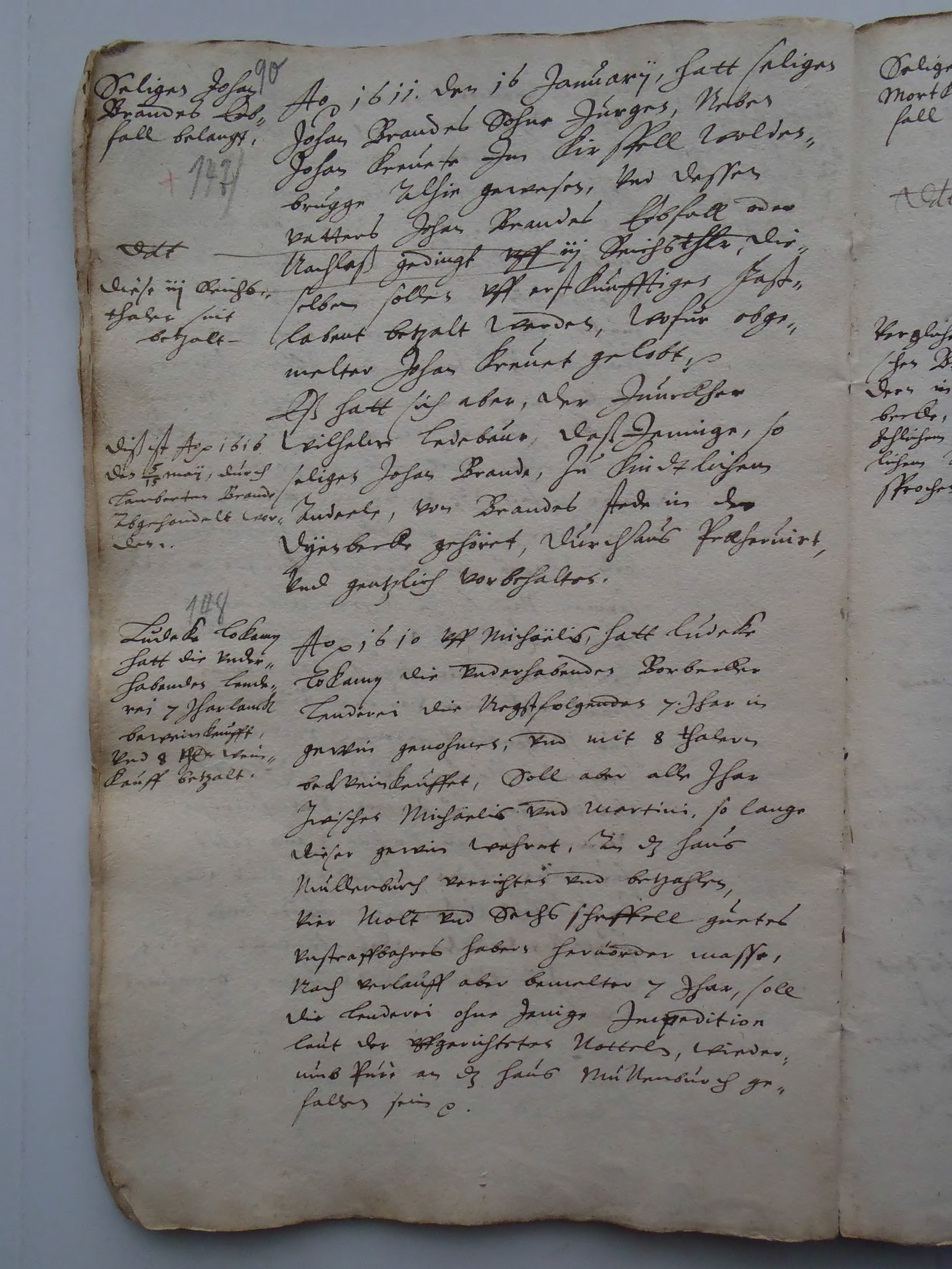 Anno 1611 den 16 January, hatt seligen Johan Brandes Sohne Jurgen, neben Johan Krevete im Kirspell Woldenbrugge alhie gewesen, und dessen Vatters Johan Brandes Erbfall oder Nachlaß gedingt uff iii [3] Reichsthaler, dieselben sollen uff erstkunfftigen Fastlabent betzalt werden, wofur obgemelter Johan Krevet gelobt. Eß hatt sich aber, der Junckher Wilhelm Ledebaur, daßjennige, so seligen Johan Brande, zu kindtlichem Andeele, von Brandes Stede in der Dyenbecke gehöret, durchaus prahervirt und gentzlilch vorbehalten.