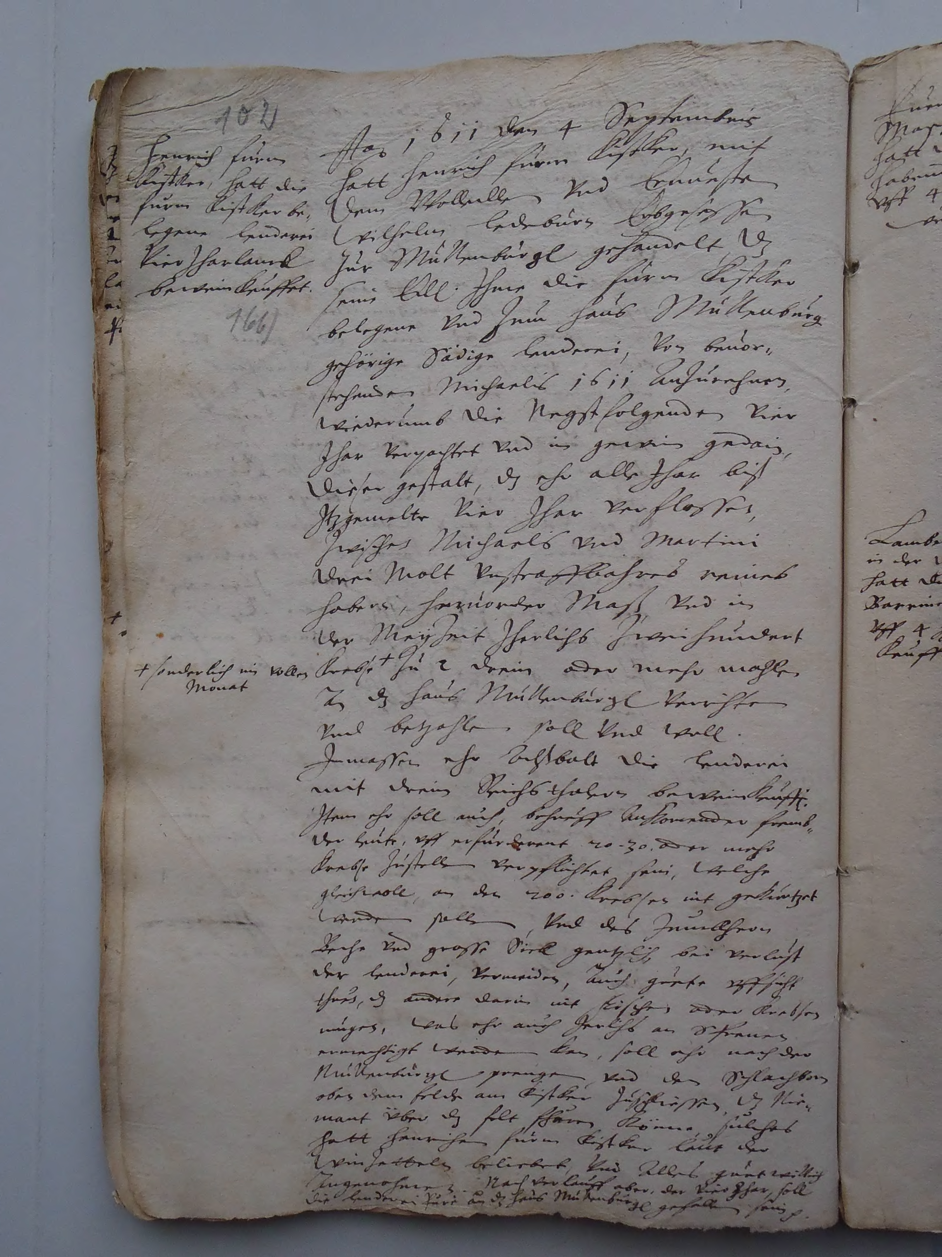 Inmassen ehr alsbalt die Lenderei mit drein Reichsthalern beweinkeufft. Item ehr soll auch, behueff ankomender frembder Leute, uff Erfurderent 20, 30 oder mehr Krebse zustellen verpflichtet sein, welche gleichwoll, an den 200 Krebsen nit gekurtzet werden sollen, und des Junckhern Beche und grosse Siek gentzlich bei Verlust der Lenderei, vermeiden, auch guete Uffsicht thuen, das andrer darin nit fischen oder krebsen mugen, was ehr auch jerlichs an Spreuen ermechtigt werden kan, soll ehr nach der Mullenburge prengen, und den Schlachboem oben dem Felde am Kistker zuschliessen, das niemant über das Felt fharen könne, sulches hatt Henrichen furm Kistker laut der Winzetteln beliebet, und alles guetwillich angenohmen. Nach Verlauff aber, der vier Jhar, soll die Lenderei puri an das Haus Mullenburge gefallen sein.