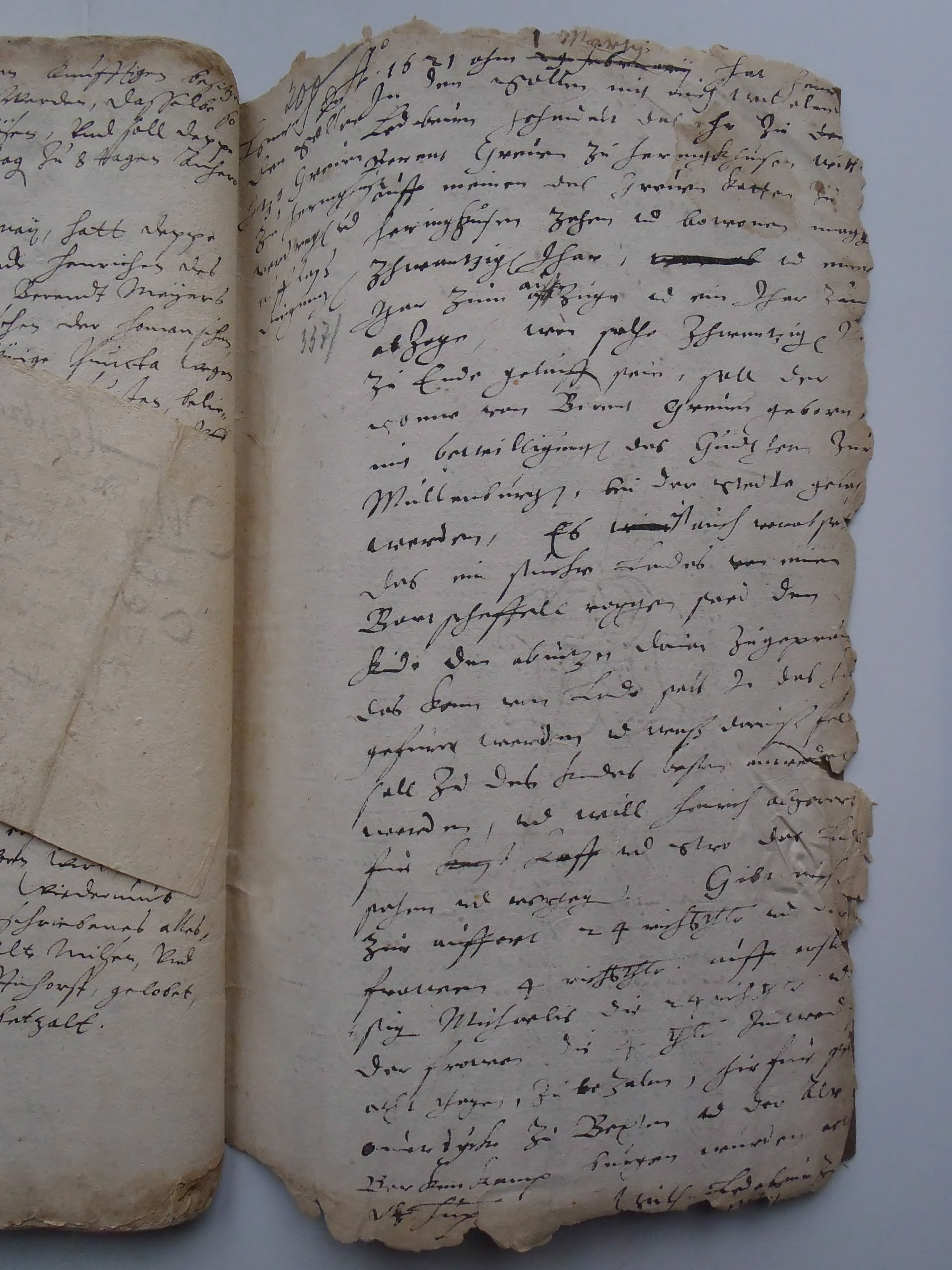 Anno 1621 ahm 1 Marty hat Henrich in den Sollen mit mich Wilhelmen Ledeburn gehandelt, das ehr zu dem Berent Greven zu Heringkhusen, will auff meinen des Greven Kotten zu Heringhusen zehen und bewonen magh zhwantzig Jhar, und eine Jhar zum Aufzuge und ein Jhar zum Abzoge, wen volhe zhwantzige Jhar zu Ende gelauffen sein, soll der Sonne von Berent Greven geborn, mit Bewilligunge des Gudthern zur Mullenburge, bei der ... gele.. werden, es ist auch ... ... des ein Stucke Landes von meine B.. Scheffell Roggen sard dem Kinde den abnutzen darin zugepruchen das Korn vom Lande soll in des ... gef.. werden und muß da.. fre. soll zu des Kindes besten ... werden, und will Henrich abge.. fur ..ff und stro der La.. ..hre und ... . Gibt mich zur Auffart 24 Reichsthaler und der Frouwen 4 Reichsthaler auff erstkunfftig Michaelis die 24 Reichsthaler und der Frouwen die 4 Thaler inwend acht Thagen, zu bezalen, hirfur sint Overdyeke zu Bexten und der alde Berkenkamp Burgen wurden. Act. vt sup Wilh. Ledeburn zur Mullenburg