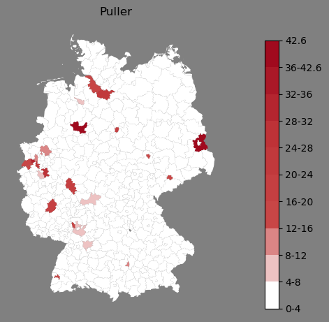 Relative Verteilung des Namens Puller (1996)Direkt zur Karte Die Farbskala zeigt die Anzahl von "Puller" bezogen auf je 1 Million Einträge. |