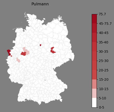 Relative Verteilung des Namens Pulmann (1996)Direkt zur Karte Die Farbskala zeigt die Anzahl von "Pulmann" bezogen auf je 1 Million Einträge. |