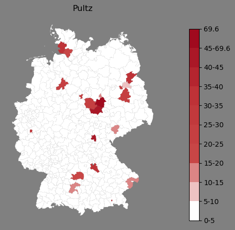 Relative Verteilung des Namens Pultz (1996)Direkt zur Karte Die Farbskala zeigt die Anzahl von "Pultz" bezogen auf je 1 Million Einträge. |