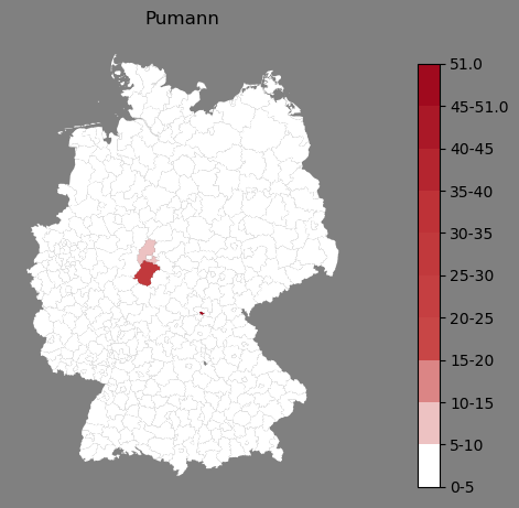 Relative Verteilung des Namens Pumann (1996)Direkt zur Karte Die Farbskala zeigt die Anzahl von "Pumann" bezogen auf je 1 Million Einträge. |