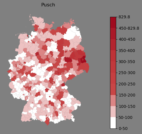 Relative Verteilung des Namens Pusch (1996)Direkt zur Karte Die Farbskala zeigt die Anzahl von "Pusch" bezogen auf je 1 Million Einträge. |