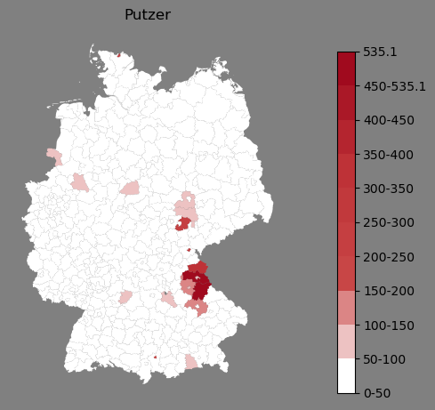 Relative Verteilung des Namens Putzer (1996)Direkt zur Karte Die Farbskala zeigt die Anzahl von "Putzer" bezogen auf je 1 Million Einträge. |