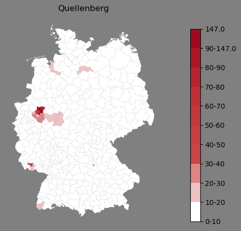 Relative Verteilung des Namens Quellenberg (1996)Direkt zur Karte Die Farbskala zeigt die Anzahl von "Quellenberg" bezogen auf je 1 Million Einträge. |