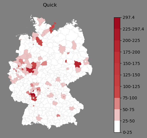 Relative Verteilung des Namens Quick (1996)Direkt zur Karte Die Farbskala zeigt die Anzahl von "Quick" bezogen auf je 1 Million Einträge. |