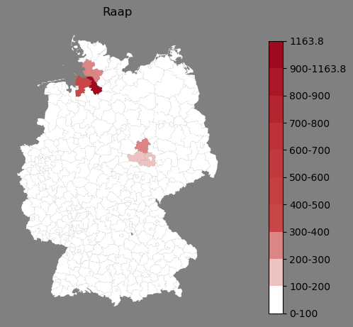 Relative Verteilung des Namens Raap (1996)Direkt zur Karte Die Farbskala zeigt die Anzahl von "Raap" bezogen auf je 1 Million Einträge. |