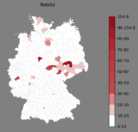 Absolute Verteilung des Namens Rabitz (1890)Direkt zur Karte Absolute Verteilung des Namens "Rabitz" um 1890 im damaligen Deutschen Reich Sie können die Karte innerhalb des Fensters zoomen und verschieben. |