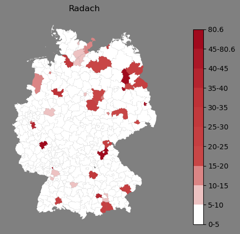 Relative Verteilung des Namens Radach (1996)Direkt zur Karte Die Farbskala zeigt die Anzahl von "Radach" bezogen auf je 1 Million Einträge. |