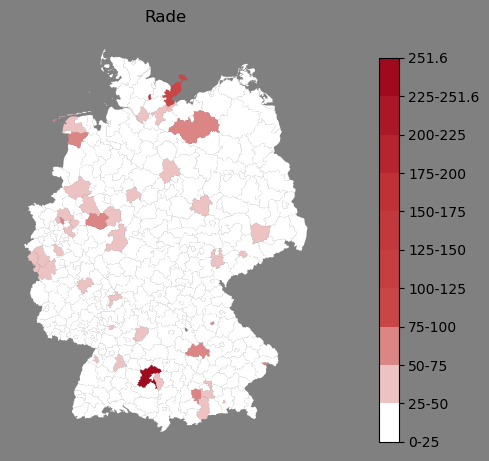 Absolute Verteilung des Namens Rade (1890)Direkt zur Karte Absolute Verteilung des Namens "Rade" um 1890 im damaligen Deutschen Reich Sie können die Karte innerhalb des Fensters zoomen und verschieben. |