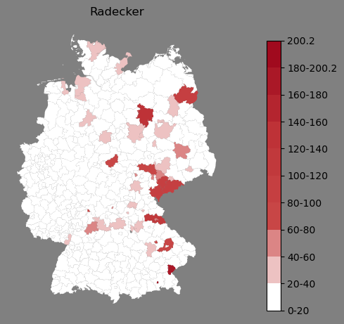Relative Verteilung des Namens Radecker (1996)Direkt zur Karte Die Farbskala zeigt die Anzahl von "Radecker" bezogen auf je 1 Million Einträge. |