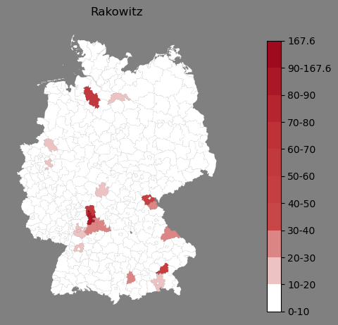 Absolute Verteilung des Namens Rakowitz (1890)Direkt zur Karte Absolute Verteilung des Namens "Rakowitz" um 1890 im damaligen Deutschen Reich Sie können die Karte innerhalb des Fensters zoomen und verschieben. |