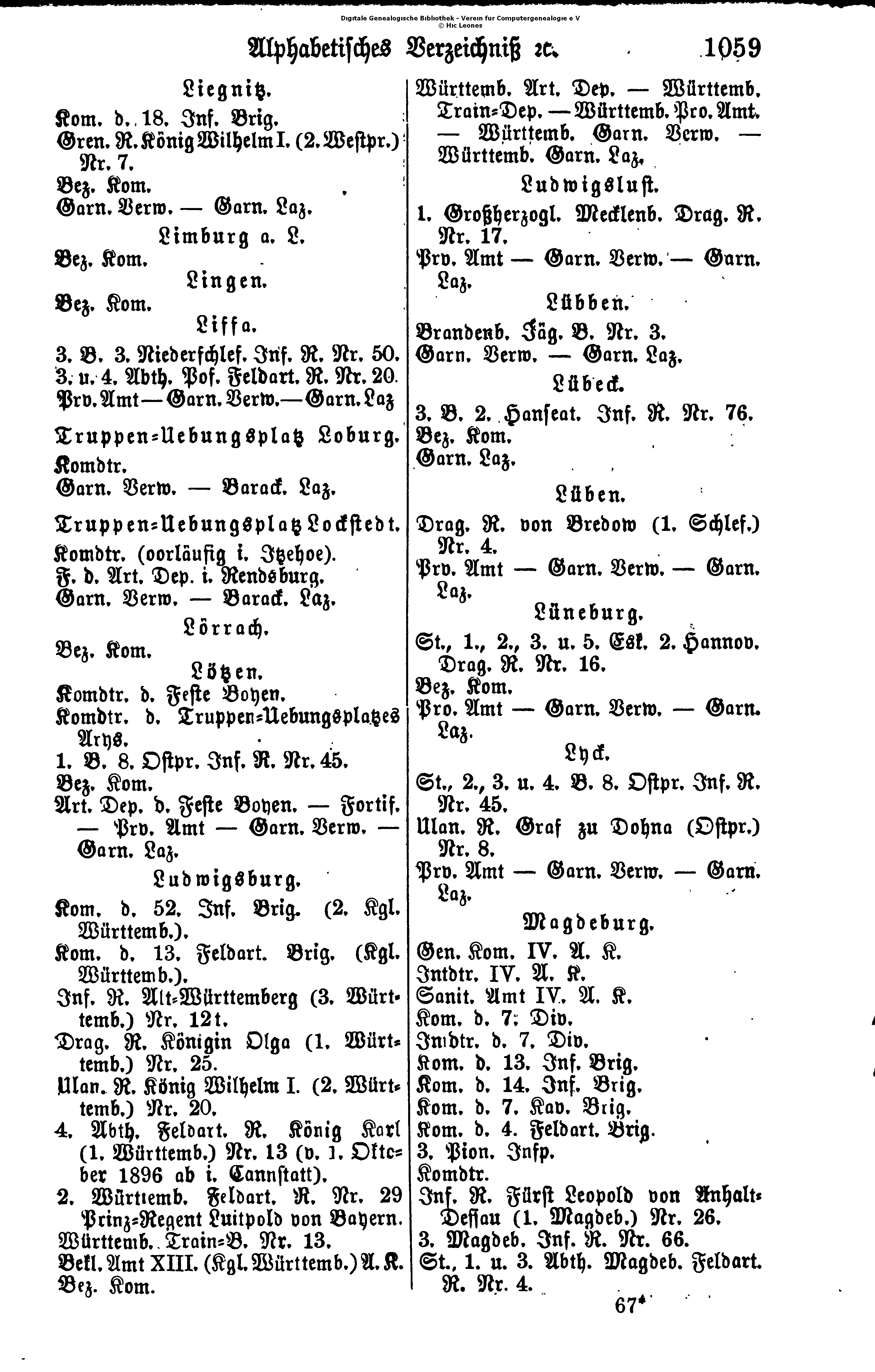 | Alphabetisches Verzeichnis der Standorte: AB C D EF G H I/JK L M N O P QR S TU VWZ Alphabetisches Verzeichnis der Landwehrbezirke Namen-Register: A B C D E F G H I/J K L M N O P QR S T U V W X Y Z | |