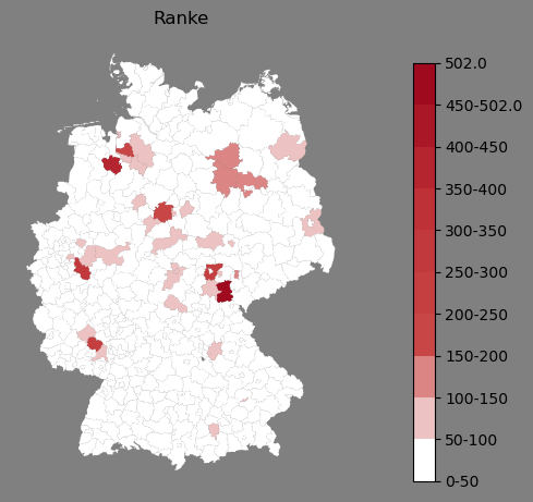 Relative Verteilung des Namens Ranke (1996)Direkt zur Karte Die Farbskala zeigt die Anzahl von "Ranke" bezogen auf je 1 Million Einträge. |