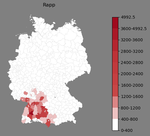 Relative Verteilung des Namens Rapp (1996)Direkt zur Karte Die Farbskala zeigt die Anzahl von "Rapp" bezogen auf je 1 Million Einträge. |