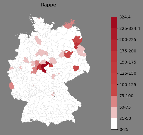 Relative Verteilung des Namens Rappe (1996)Direkt zur Karte Die Farbskala zeigt die Anzahl von "Rappe" bezogen auf je 1 Million Einträge. |