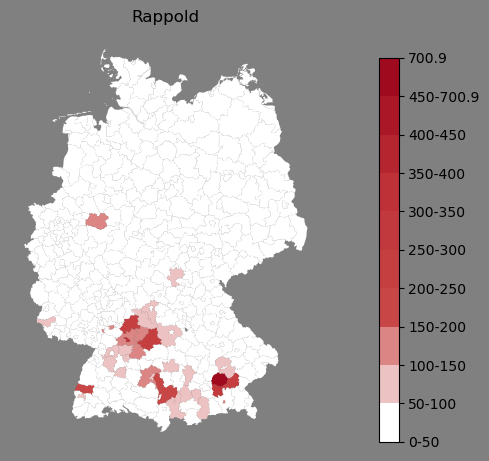 Relative Verteilung des Namens Rappold (1996)Direkt zur Karte Die Farbskala zeigt die Anzahl von "Rappold" bezogen auf je 1 Million Einträge. |
