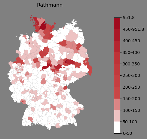Absolute Verteilung des Namens Rathmann (1890)Direkt zur Karte Absolute Verteilung des Namens "Rathmann" um 1890 im damaligen Deutschen Reich Sie können die Karte innerhalb des Fensters zoomen und verschieben. |