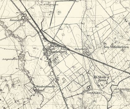 Die 1893/94 in Betrieb gesetzte eingleisige Eisenbahnverbindung Tilsit - Stallupönen hat zu einer enormen Fortentwicklung der ganzen Region erheblich beigetragen. Drei Zugpaare verkehrten täglich, und zeitweise wurde auch noch ein Triebwagen zwischen Tilsit und Rautenberg eingesetzt. Neben dem Personenverkehr wurden Güter- und Viehtransporte durchgeführt, da auch hierfür die erforderlichen Vorrichtungen bestanden.