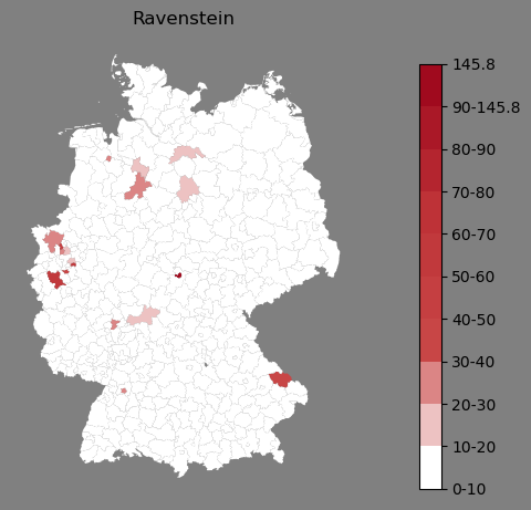 Absolute Verteilung des Namens Ravenstein (1890)Direkt zur Karte Absolute Verteilung des Namens "Ravenstein" um 1890 im damaligen Deutschen Reich Sie können die Karte innerhalb des Fensters zoomen und verschieben. |