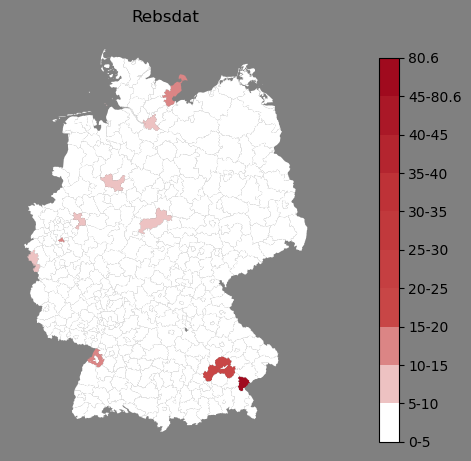 Relative Verteilung des Namens Rebsdat (1996)Direkt zur Karte Die Farbskala zeigt die Anzahl von "Rebsdat" bezogen auf je 1 Million Einträge. |