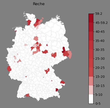 Relative Verteilung des Namens Reche (1996)Direkt zur Karte Die Farbskala zeigt die Anzahl von "Reche" bezogen auf je 1 Million Einträge. |