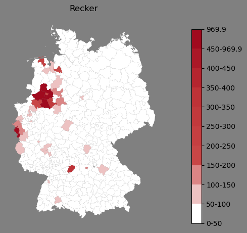 Relative Verteilung des Namens Recker (1996)Direkt zur Karte Die Farbskala zeigt die Anzahl von "Recker" bezogen auf je 1 Million Einträge. |