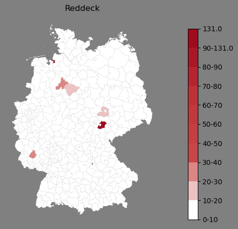 Relative Verteilung des Namens Reddeck (1996)Direkt zur Karte Die Farbskala zeigt die Anzahl von "Reddeck" bezogen auf je 1 Million Einträge. |