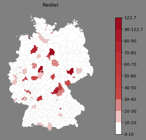 Relative Verteilung des Namens Redler (1996)Direkt zur Karte Die Farbskala zeigt die Anzahl von "Redler" bezogen auf je 1 Million Einträge. |