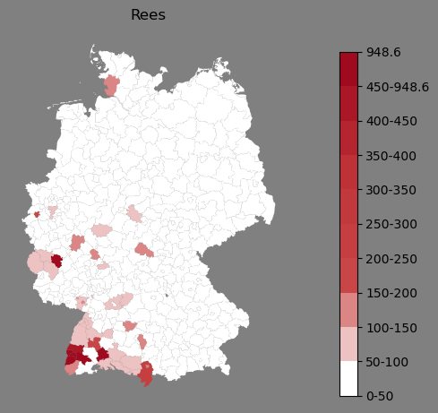 Relative Verteilung des Namens Rees (1996)Direkt zur Karte Die Farbskala zeigt die Anzahl von "Rees" bezogen auf je 1 Million Einträge. |