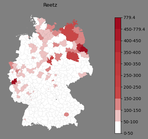 Relative Verteilung des Namens Reetz (1996)Direkt zur Karte Die Farbskala zeigt die Anzahl von "Reetz" bezogen auf je 1 Million Einträge. |