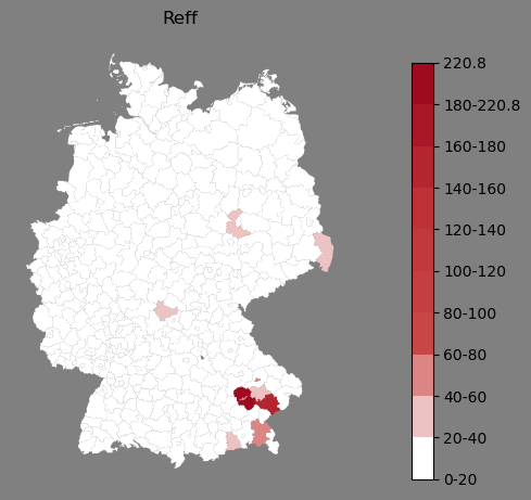 Relative Verteilung des Namens Reff (1996)Direkt zur Karte Die Farbskala zeigt die Anzahl von "Reff" bezogen auf je 1 Million Einträge. |