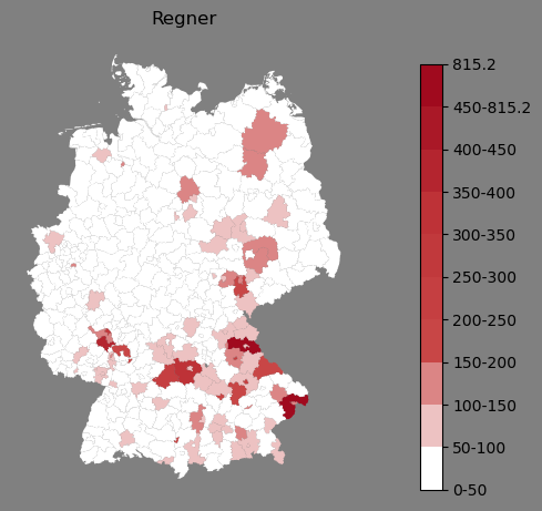 Relative Verteilung des Namens Regner (1996)Direkt zur Karte Die Farbskala zeigt die Anzahl von "Regner" bezogen auf je 1 Million Einträge. |
