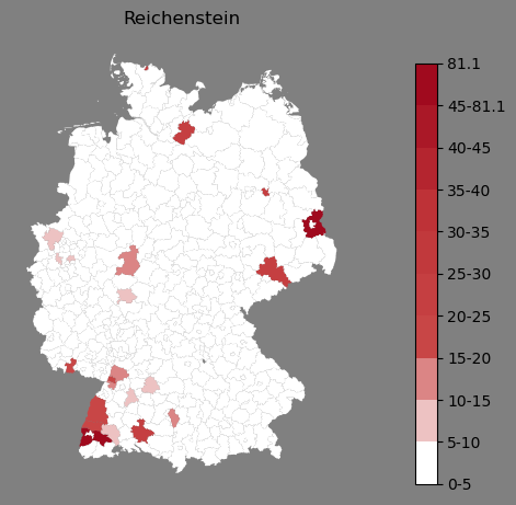 Absolute Verteilung des Namens Reichenstein (1890)Direkt zur Karte Absolute Verteilung des Namens "Reichenstein" um 1890 im damaligen Deutschen Reich Sie können die Karte innerhalb des Fensters zoomen und verschieben. |