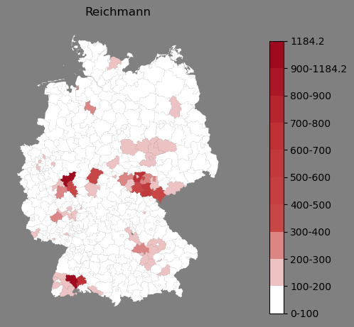 Absolute Verteilung des Namens Reichmann (1890)Direkt zur Karte Absolute Verteilung des Namens "Reichmann" um 1890 im damaligen Deutschen Reich Sie können die Karte innerhalb des Fensters zoomen und verschieben. |