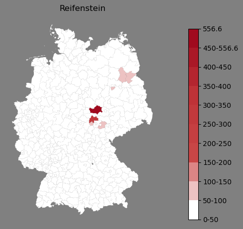 Relative Verteilung des Namens Reifenstein (1996)Direkt zur Karte Die Farbskala zeigt die Anzahl von "Reifenstein" bezogen auf je 1 Million Einträge. |