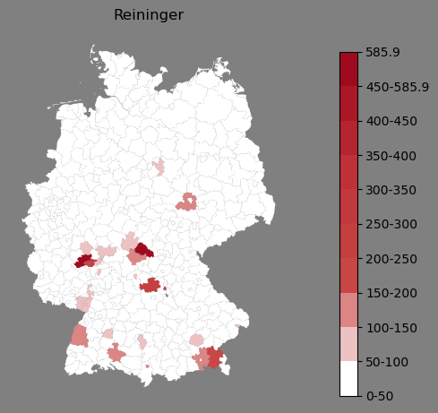 Relative Verteilung des Namens Reininger (1996)Direkt zur Karte Die Farbskala zeigt die Anzahl von "Reininger" bezogen auf je 1 Million Einträge. |