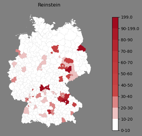 Relative Verteilung des Namens Reinstein (1996)Direkt zur Karte Die Farbskala zeigt die Anzahl von "Reinstein" bezogen auf je 1 Million Einträge. |