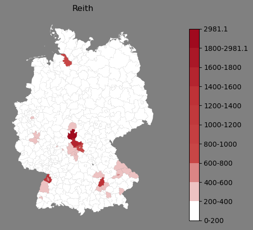 Relative Verteilung des Namens Reith (1996)Direkt zur Karte Die Farbskala zeigt die Anzahl von "Reith" bezogen auf je 1 Million Einträge. |