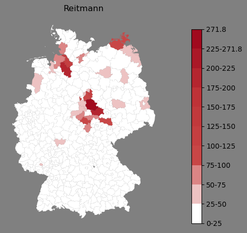 Absolute Verteilung des Namens Reitmann (1890)Direkt zur Karte Absolute Verteilung des Namens "Reitmann" um 1890 im damaligen Deutschen Reich Sie können die Karte innerhalb des Fensters zoomen und verschieben. |