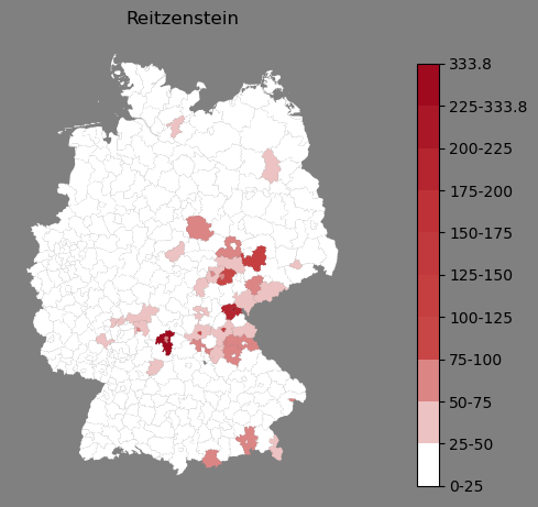 Relative Verteilung des Namens Reitzenstein (1996)Direkt zur Karte Die Farbskala zeigt die Anzahl von "Reitzenstein" bezogen auf je 1 Million Einträge. |