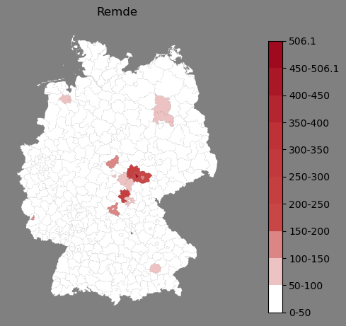 Absolute Verteilung des Namens Remde (1890)Direkt zur Karte Absolute Verteilung des Namens "Remde" um 1890 im damaligen Deutschen Reich Sie können die Karte innerhalb des Fensters zoomen und verschieben. |