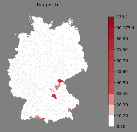 Relative Verteilung des Namens Reppisch (1996)Direkt zur Karte Die Farbskala zeigt die Anzahl von "Reppisch" bezogen auf je 1 Million Einträge. |