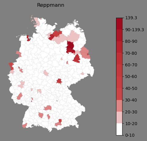 Absolute Verteilung des Namens Reppmann (1890)Direkt zur Karte Absolute Verteilung des Namens "Reppmann" um 1890 im damaligen Deutschen Reich Sie können die Karte innerhalb des Fensters zoomen und verschieben. |