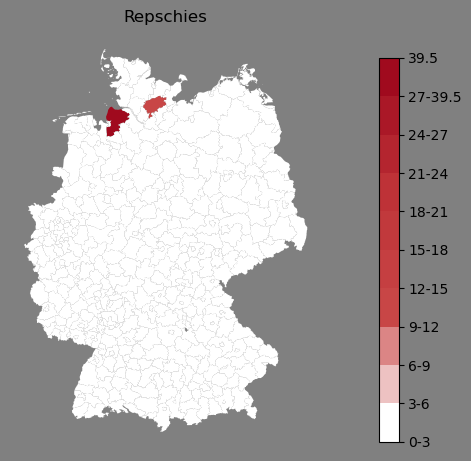 Relative Verteilung des Namens Repschies (1996)Direkt zur Karte Die Farbskala zeigt die Anzahl von "Repschies" bezogen auf je 1 Million Einträge. |